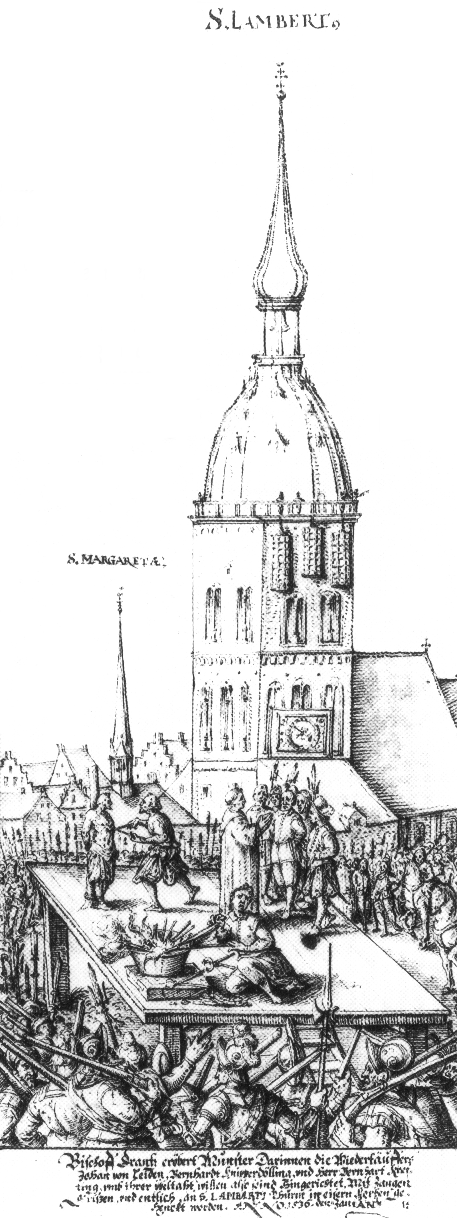 Georg Bergerin aikalaiskuva Münsterin kastajien kohtaloista. Taustalla näkyvät St. Lambertin kirkontorniin ripustetut rautahäkit, joissa kastajajohtajien ruumiita pidettiin esillä. Kuva: Wikimedia Commons.